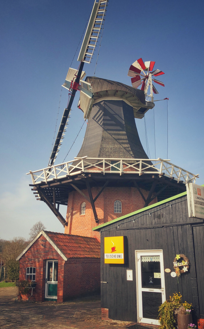 Dreistöckiger Galerieholländer mit Windrose, Getreidemühle, Gewerbebetrieb, 3 Schrotgänge, 2 Graupengänge, 1 Mahlgang, Die Mühle wurde 2001 vollständig wieder aufgebaut. Besichtigung nach Vereinbarung Die vier Müllerinnen sind gerne bereit, Ihnen mehr über das Müllerhandwerk zu erzählen. Bei Voranmeldung wird in der angrenzenden Teescheune nach Ihren Wünschen die Tee- oder Kaffeetafel bis zu einer Anzahl von 70 Personen gedeckt.